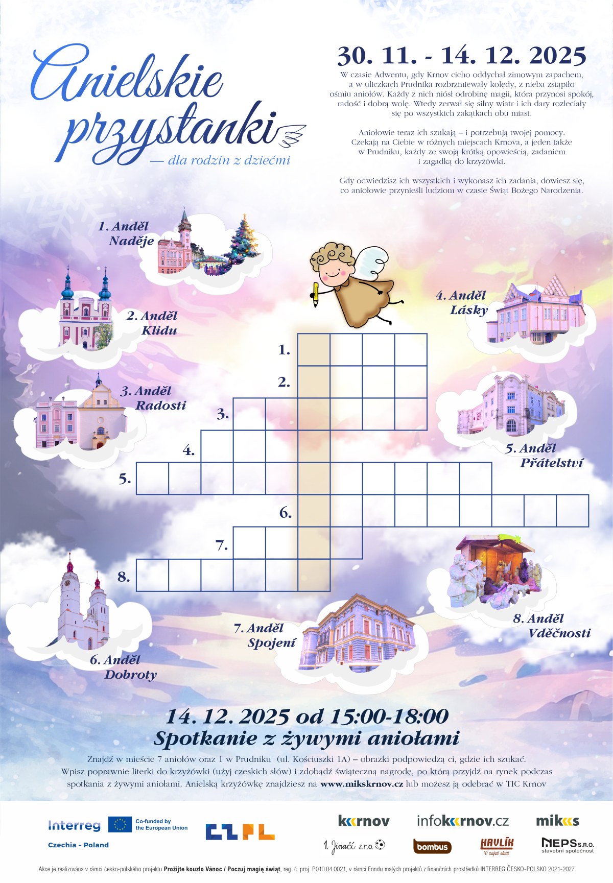 • Zapište odpovědi na andělské otázky a získejte odměnou vánoční balíček. Balíčky budou vydávány v neděli 14. 12. v čase 15.00–18.00 na krnovském Hlavním náměstí, kde se můžete i potkat s živými anděly.