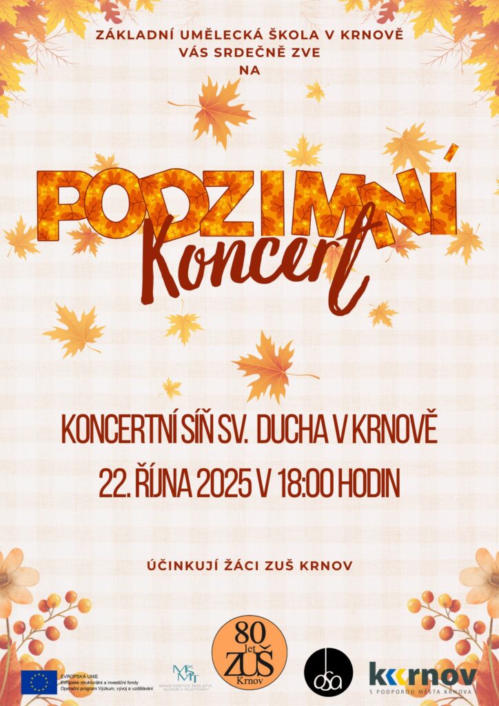 Milí přátelé, srdečně vás zveme na první veřejný koncert tohoto školního roku 2025/2026, který se uskuteční ve středu 22. října 2025 v 18:00 hod. v Koncertní síni sv. Ducha v Krnově. Vystoupí talentovaní žáci naší školy napříč všemi obory.
