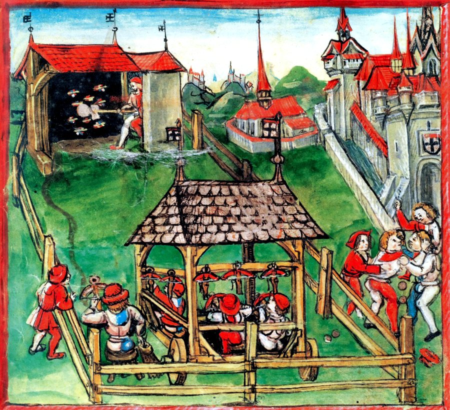 Vyobrazení městské střelnice v Kostnici z roku 1458. Střelnice, vymezená dřevěnou ohradou, je mimo jiné vybavena zastřešeným odpočívadlem, kde vyčkávali střelci, kteří právě nebyli na řadě. Odpočívadlo je přitom vybaveno koly, bylo možné jej tudíž přemístit. Ke koloritu střeleckých cvičení a slavností patřily i spory, a dokonce rvačky některých účastníků, jak to vidíme v pravé části výjevu. Jak byla vybavena místa, kde cvičili členové krnovského střeleckého bratrstva, detailně nevíme. Odpočívadlo je však zmiňováno. Časté hádky, spory, a dokonce rvačky mezi jednotlivými střelci rovněž.