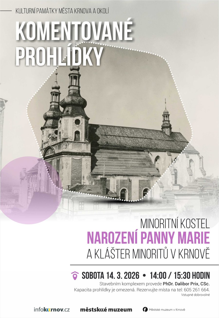 Městské muzeum ve spolupráci s Konventem minoritů v Krnově připravilo pro širokou veřejnost dvě komentované prohlídky kostela Narození Panny Marie a kláštera minoritů. Stavebním komplexem provede návštěvníky historik umění PhDr. Dalibor Prix, který se zaměřuje především na středověkou architekturu.